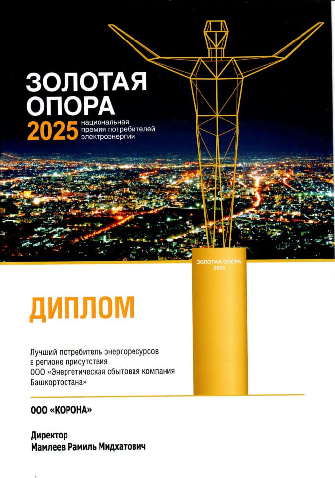 Уфа, декабрь 2025 года. — Мебельная фабрика «Корона» завершает год значительным достижением — получением диплома и звания «Лучший потребитель энергоресурсов в регионе присутствия ООО «ЭСКБ». Эта награда является частью авторитетной всероссийской премии «Золотая Опора-2025», которая отмечает самых добросовестных и прогрессивных потребителей электроэнергии.